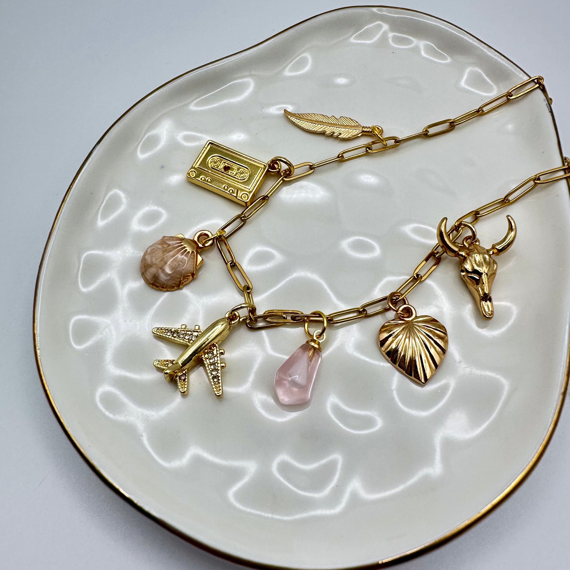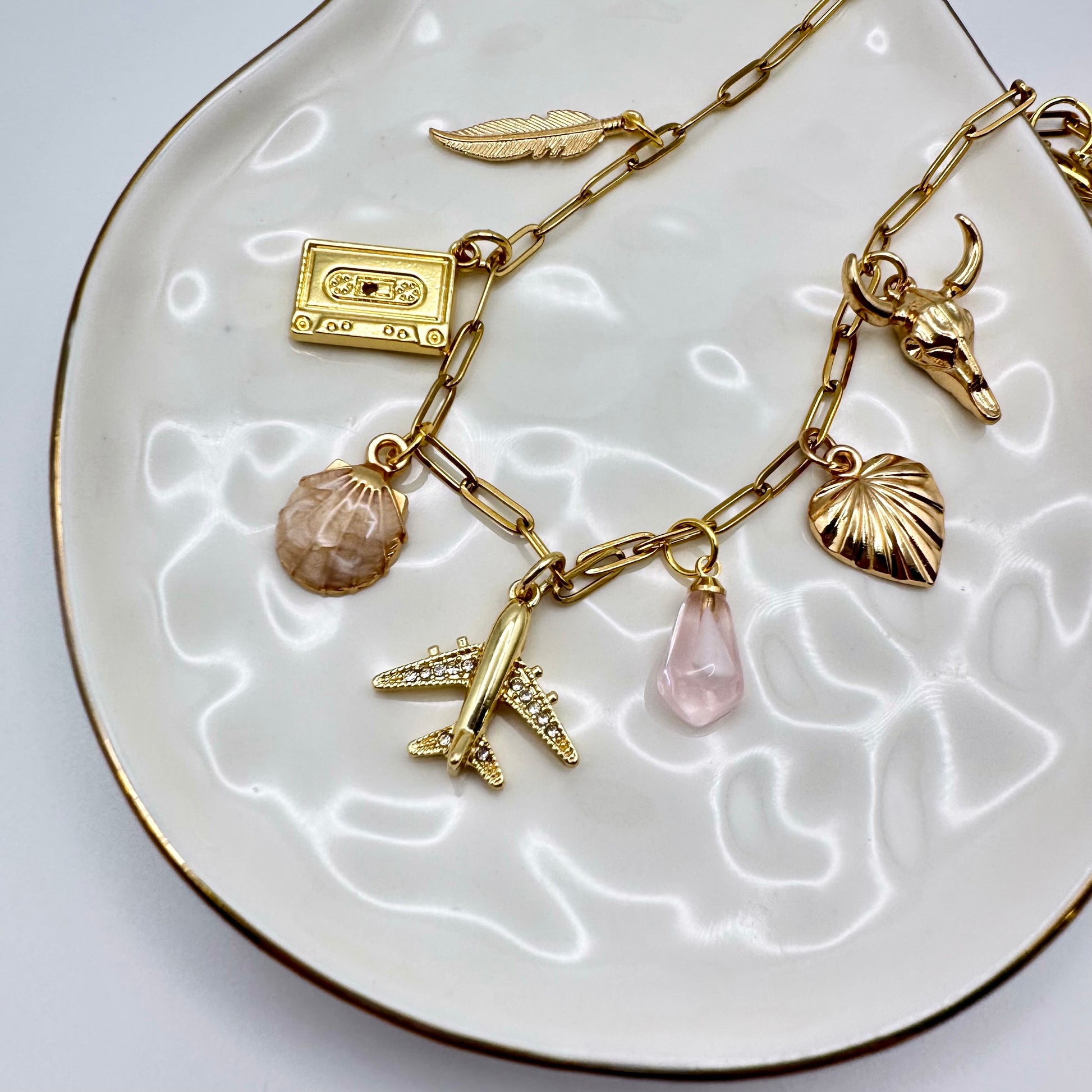 A little golden magic for the traveler at heart. The Wanderwish Charm Necklace is a one-of-a-kind, handcrafted piece strung with seven hand-selected charms. Each one holds a spark of adventure: a glittering airplane, vintage cassette tape, feather, soft rose quartz teardrop, cow skull, seashell, and a sculpted heart.