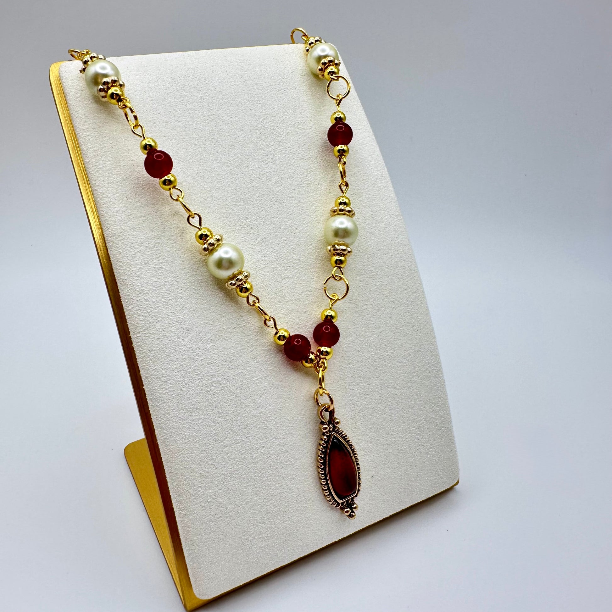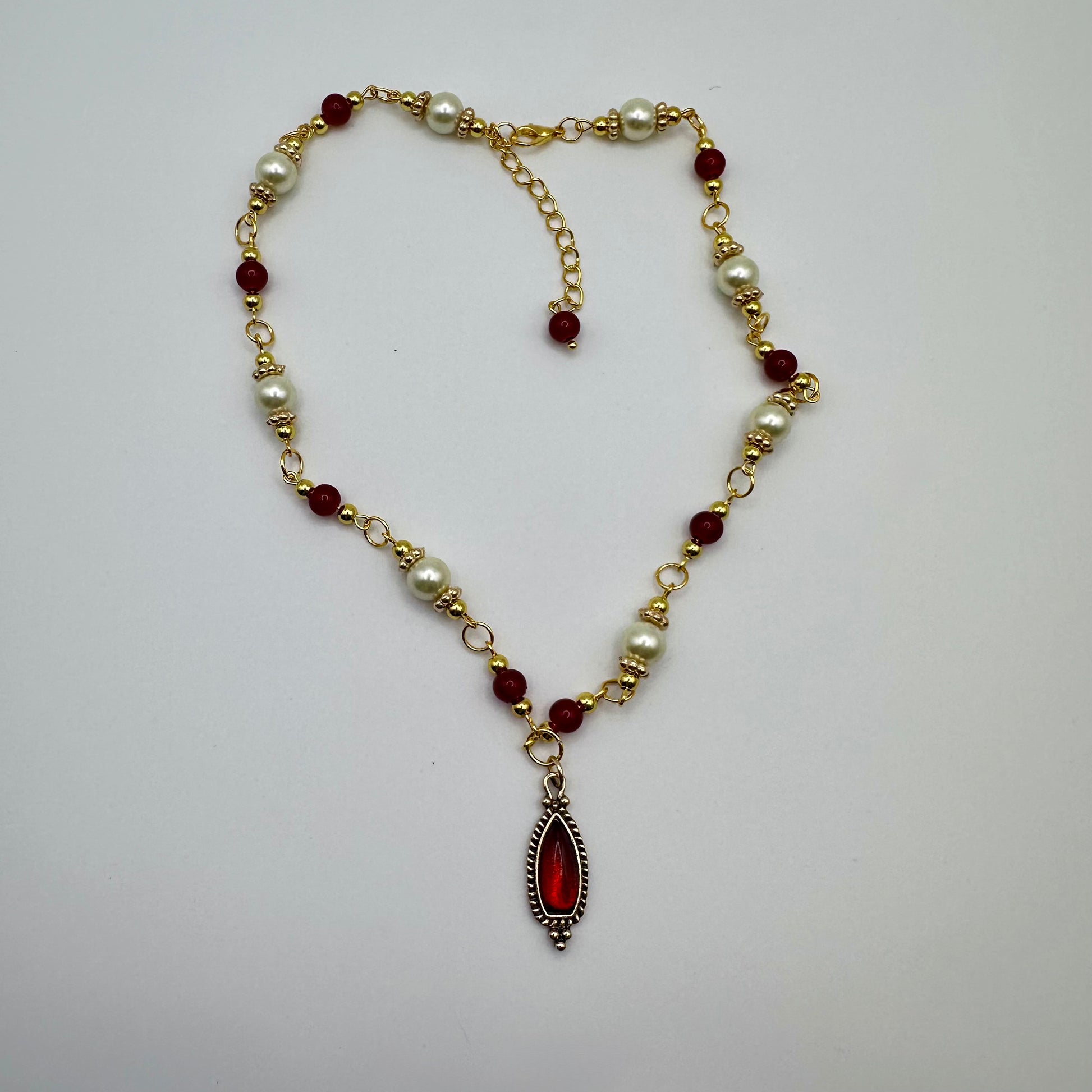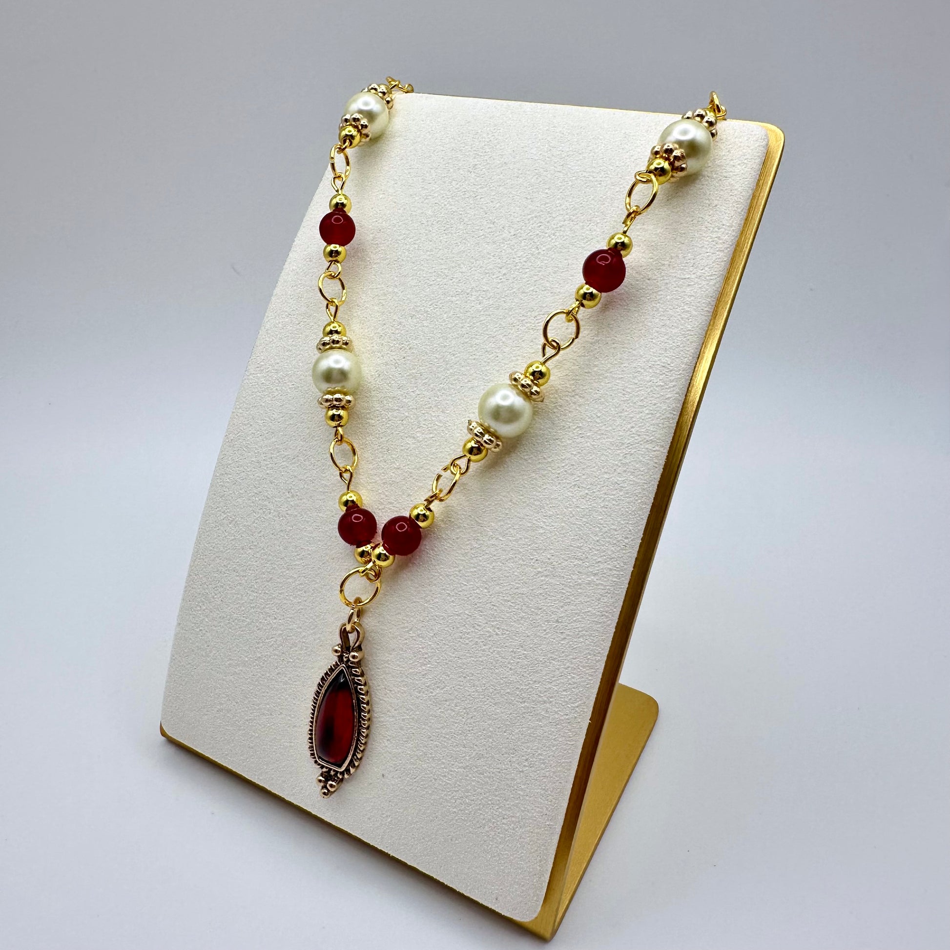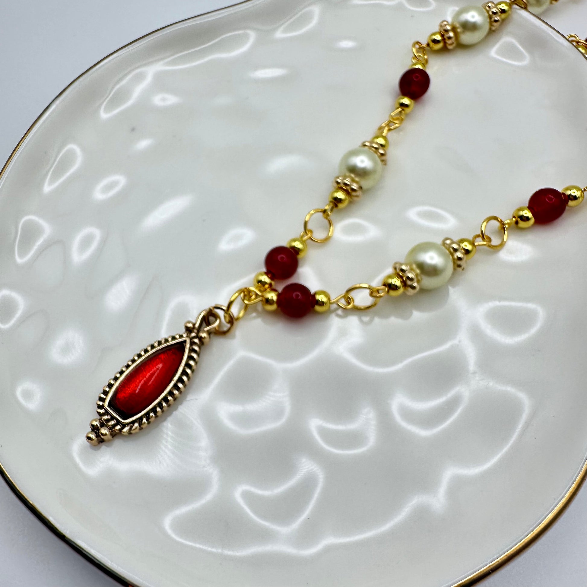 Elegant, bold, and unmistakably romantic. The Crimson Charm Pearl Chain Necklace blends creamy pearls with rich red beads and gold accents for a look that’s both vintage-inspired and striking. At the center rests a deep crimson drop pendant, adding just the right amount of intensity and drama.