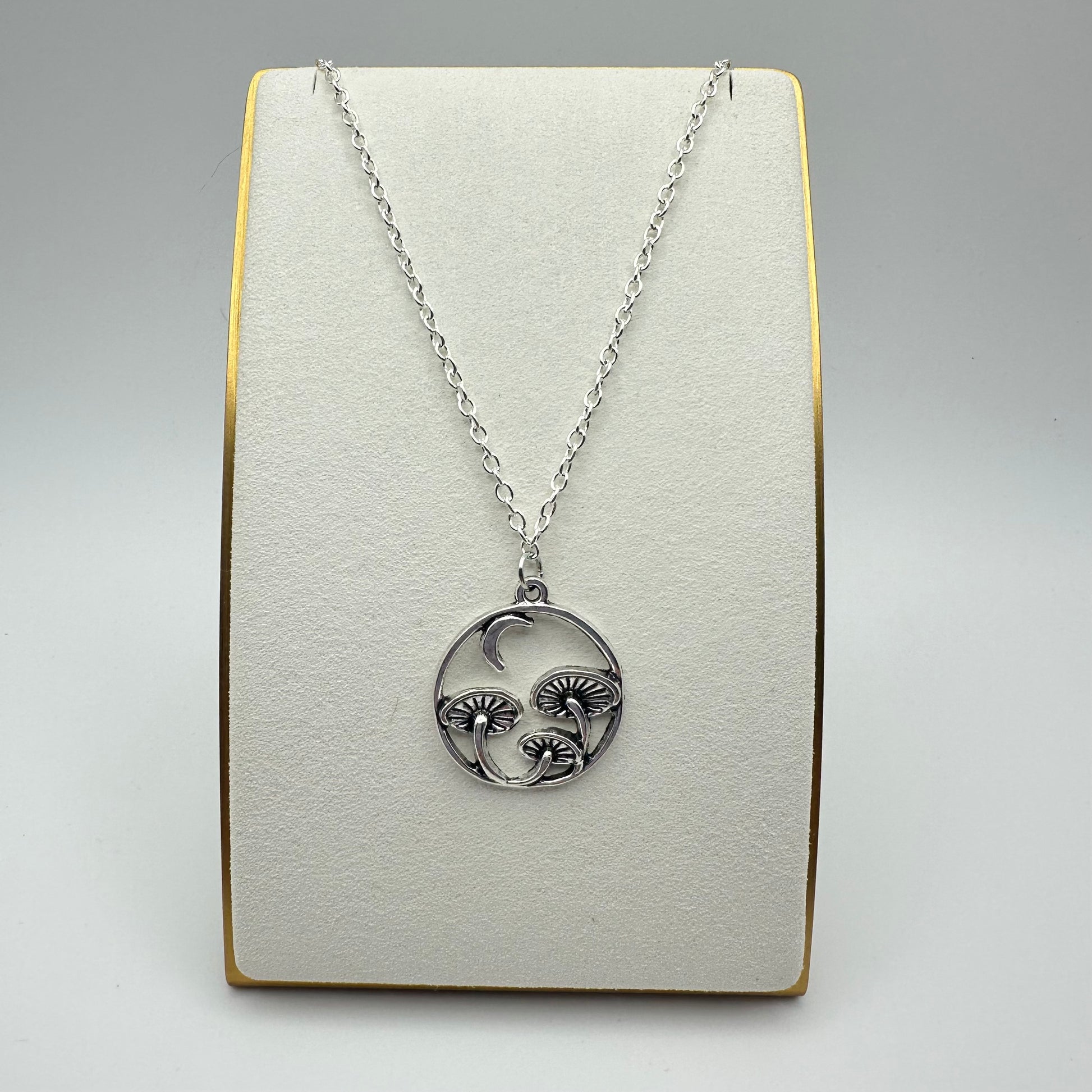 Quiet magic grows in the shadows β€” and the Moonlit Mycena Necklace captures that woodland wonder. This enchanting silver-tone piece features a trio of tiny mushrooms beneath a crescent moon, nestled in a circular frame. Suspended from a simple silver-plated chain, it’s dainty, dreamy, and full of forestcore charm.