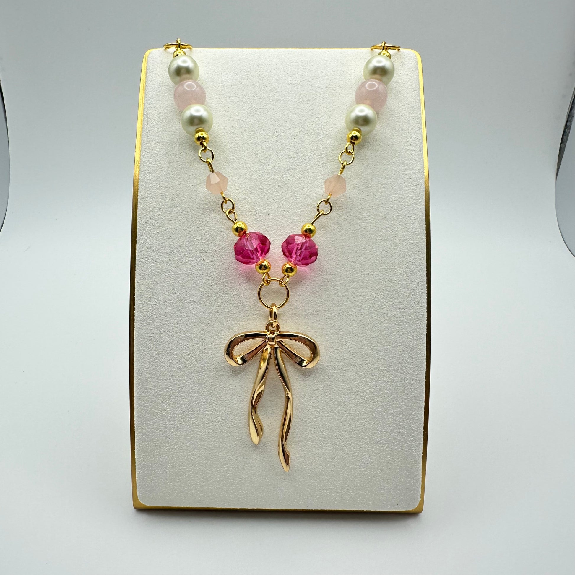 Sweet as a handwritten love note, the Ribboned Rose Beaded Necklace is a delicate blend of classic romance and girlish charm. Featuring soft faux pearls, pink glass accents, and a graceful gold-plated bow pendant, this piece is perfect for those who adore dainty elegance with a touch of coquette flair.