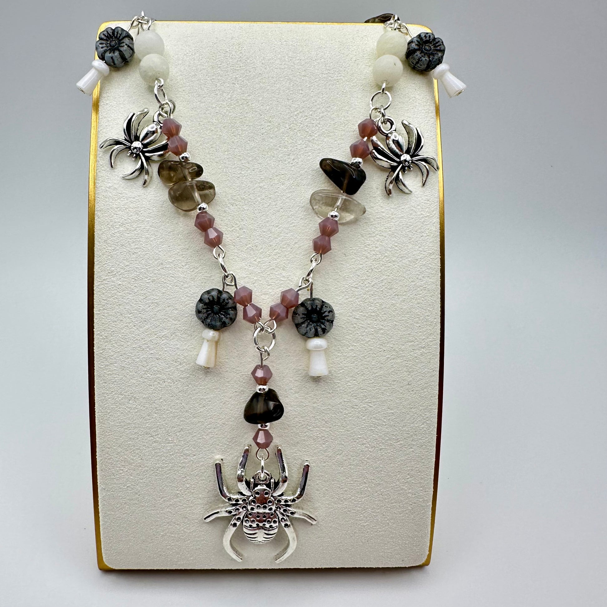 Step into a blooming shadow realm with the Witch’s Garden Statement Necklace. This silver-tone piece combines eerie elegance with a sprinkle of garden mischief, featuring detailed spider charms, dark flower beads, tiny mushrooms, natural stone chips, and soft cream-toned rounds.