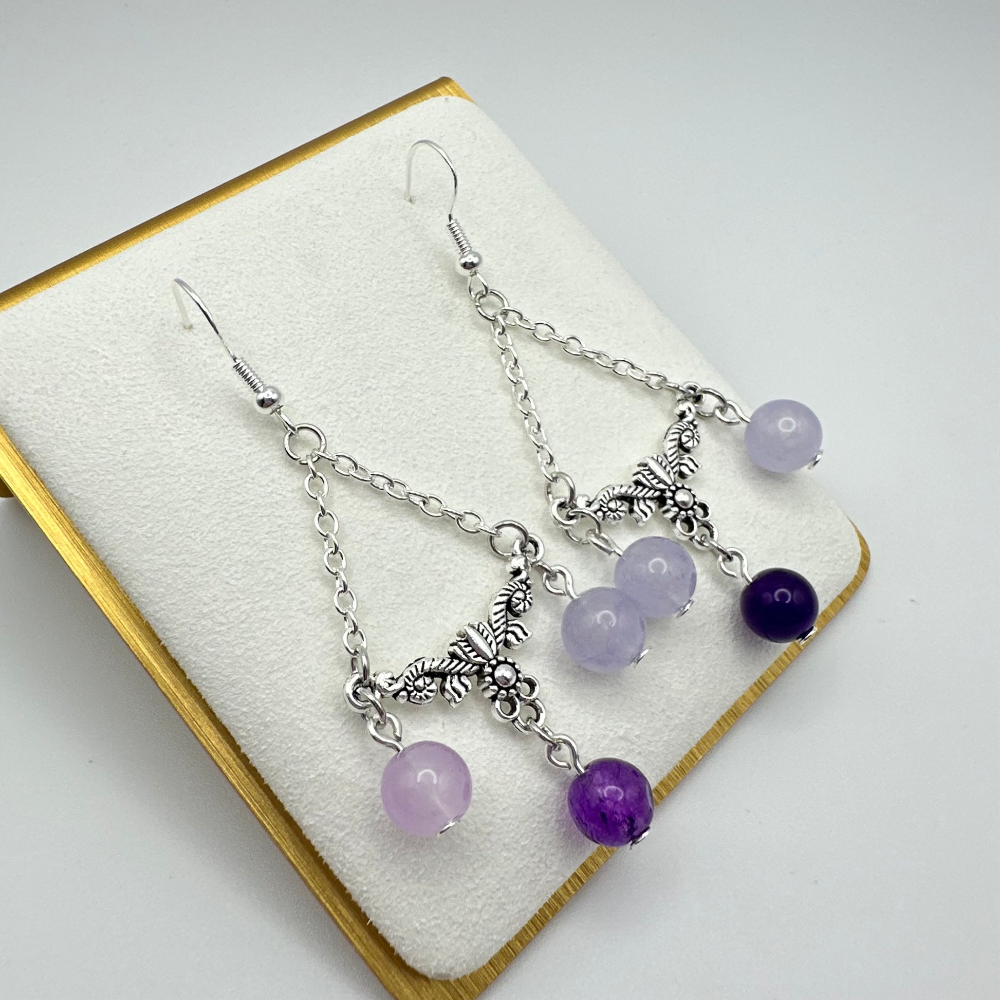 Delicate and enchanting, the Amethyst Garden Chandelier Earrings are a soft statement piece inspired by twilight meadows and fluttering wings. Featuring cascading glass beads in dreamy lavender and one rich, genuine amethyst drop, these earrings are anchored by an ornate silver butterfly charm and suspended from delicate silver chain. They’re graceful, witchy, and wildly wearable. 💜🦋