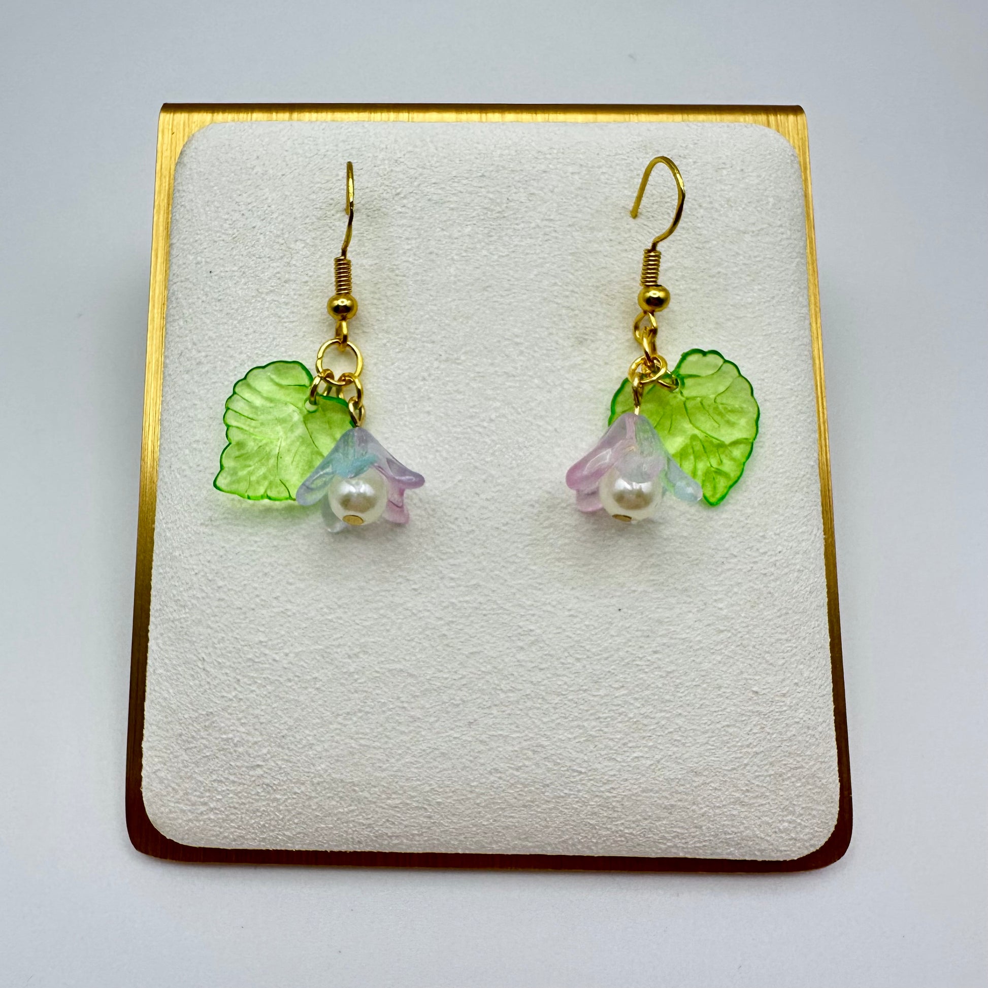 Add a little fairy sparkle to your everyday look with the “Lilylight Whimsy” Earrings. These lightweight dangles feature soft pastel lily flowers, translucent green leaves, and pearly accents — all brought together with warm gold findings. Sweet and subtle, they’re perfect for a stroll through a meadow or a dreamy afternoon read.