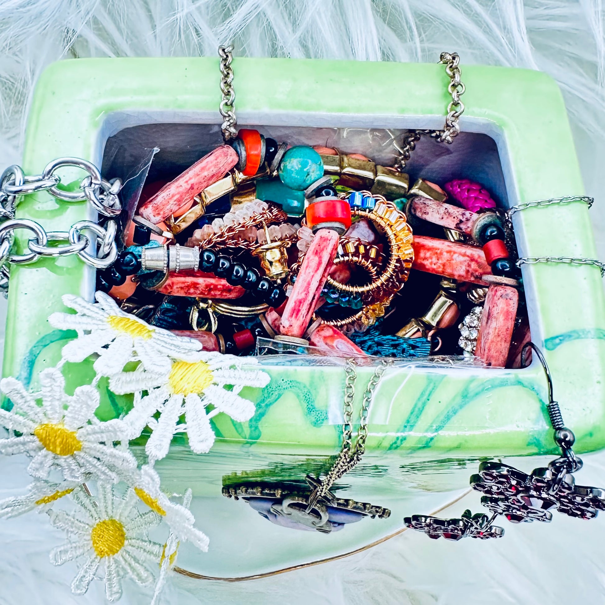 A daisy daydream of sparkle πΌπβ¨ Each jar is brimming with vintage and pre-loved jewelry β¨ plus a handmade earring set created by me π